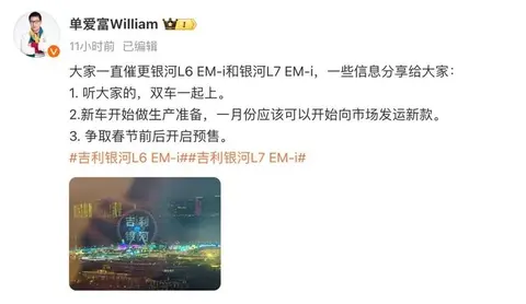 近日,吉利银河官方透露,新款银河L6/L7已经开始做生产准备,并将于春节前后开启预售,预计2025年1月就能出现在各地经销商处。作为参考,现款银河L6售价区间为9.98万-14.98万;现款银河L7售价区间为12.57万-16.97万。
