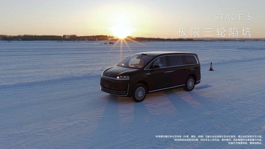 最后是冰雪大圆环测试,半径120米,时速拉到90公里。这个项目验证的是车辆在高速过弯时的稳定性,对应冬季跑高速、过环路匝道时的场景。智界V9在雪环上跑得挺稳,循迹性不错,侧倾控制也在合理范围内。这意味着在雨雪天气跑长途,至少不用太紧张方向盘,车身的可控性能减少不少驾驶负担。